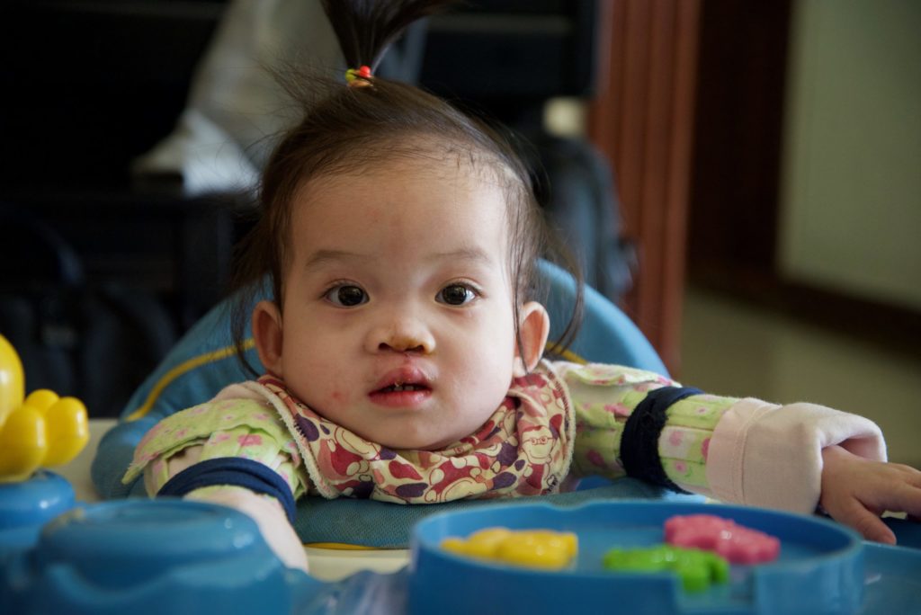 Xiao is a tiny one-and-a-half-year-old girl with a floppy ponytail sticking up from the top of her head. Xiao had cleft lip surgery three days ago, but her lip is so well healed already, with stitches only visible inside her lip. Her top lip was a bit swollen, but you could barely see the seam where a cleft had once been.
