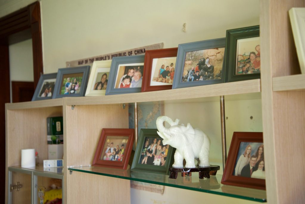 In the Peace House living room, framed images of adoptive families line the top of a tall shelf holding a TV and a display case full of children’s books. Photos of Harry and Bertha Holt, Holt’s founders, dot the walls and a giant photo montage of children spells out “Everything is for the Children” on one whole wall.