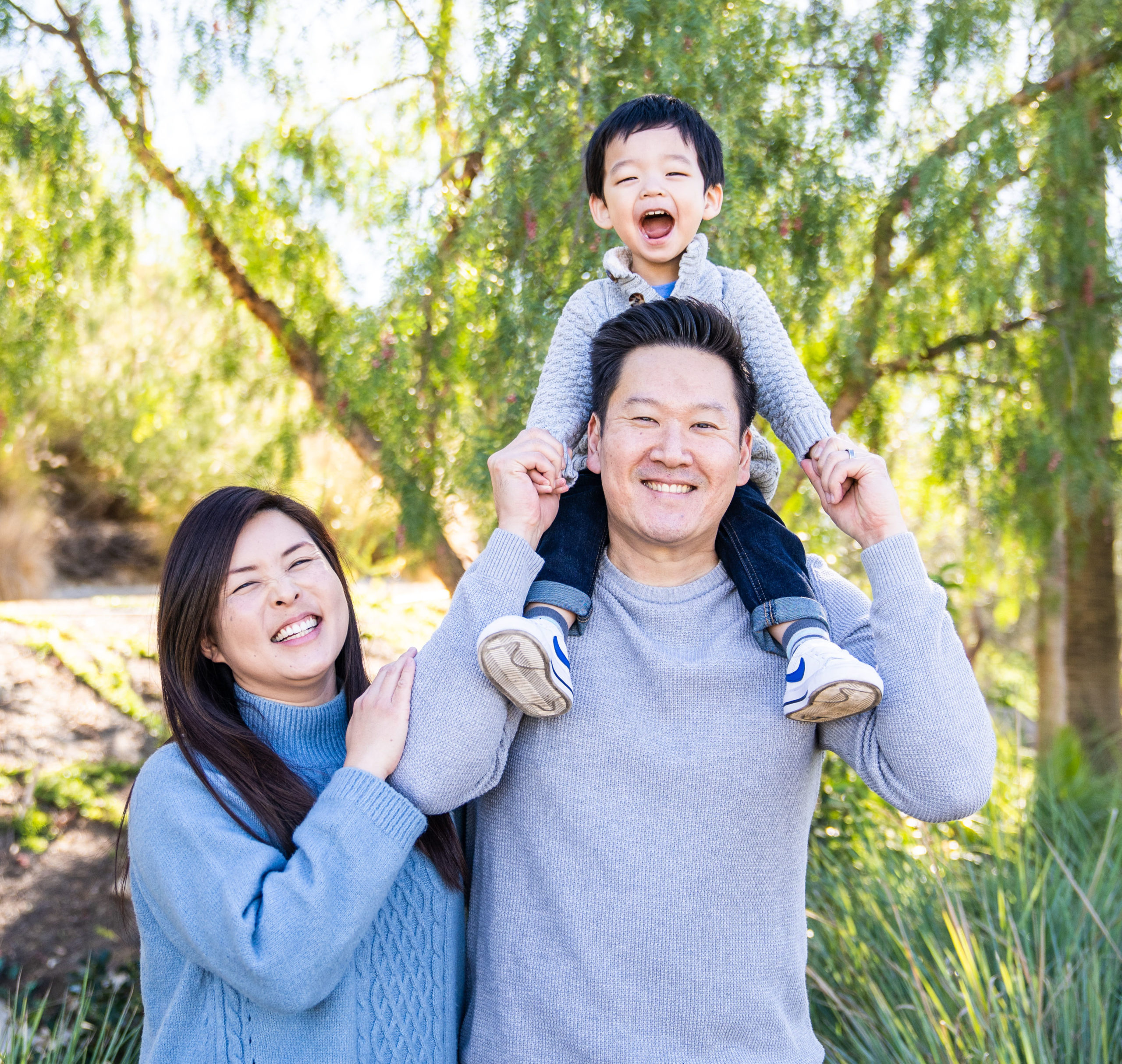 mom adoptive son and dad holding hands and laughing