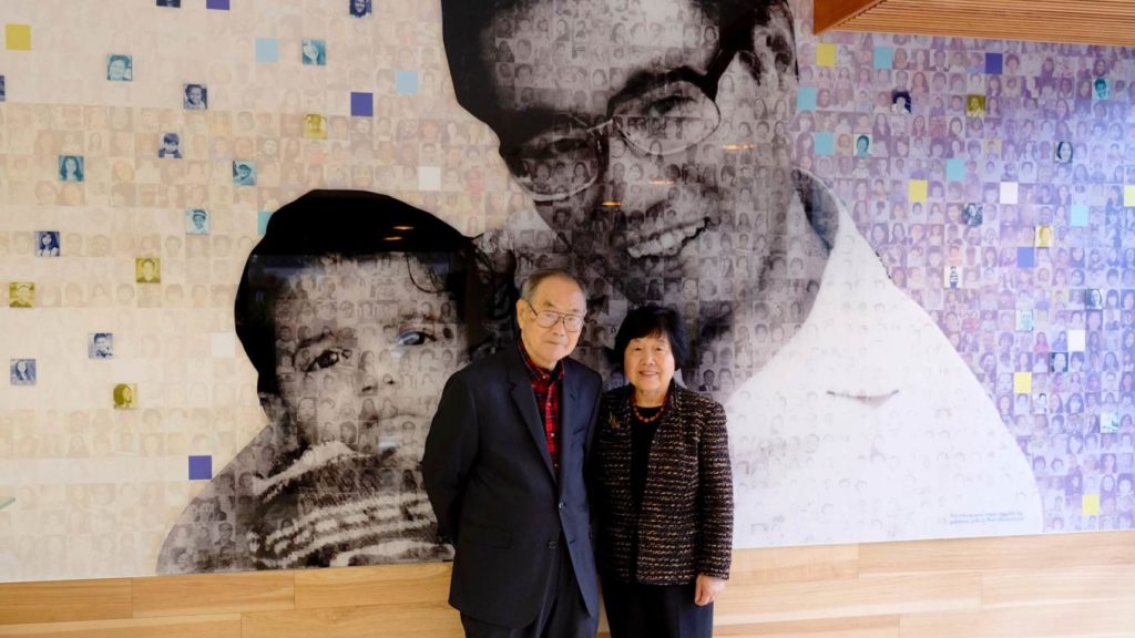 Nancy and David Kim stand before a tribute to David in the lobby of Holt’s building in Eugene in 2016. Every tiny image is a picture of a child who joined a family through adoption.