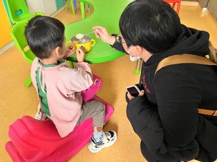 A Holt staff member helps feed a child while visiting an orphanage in China.