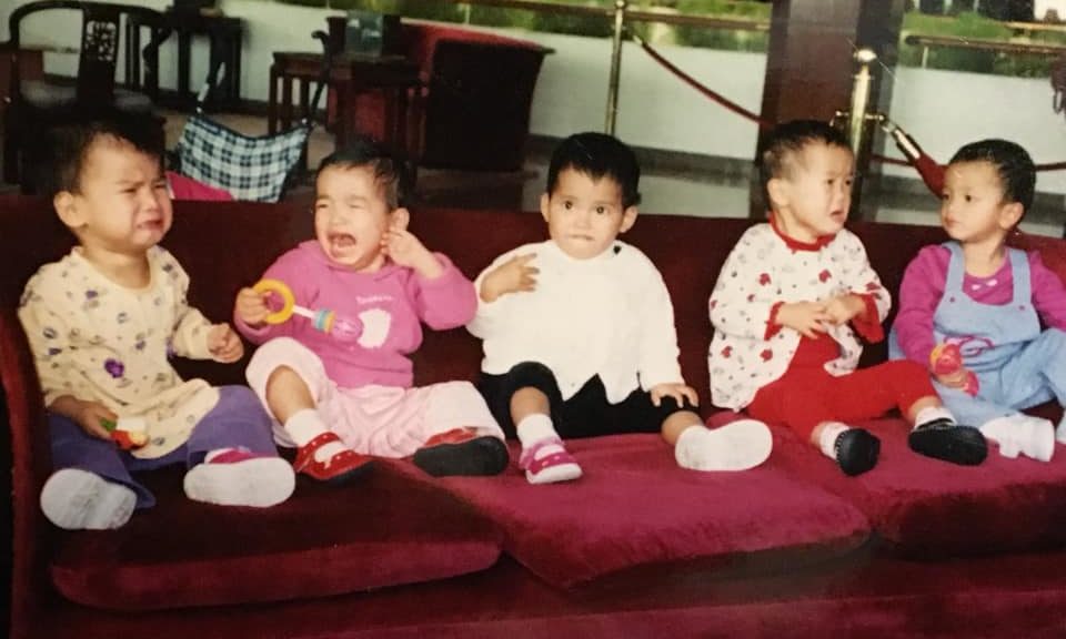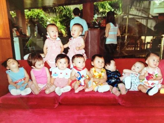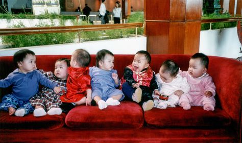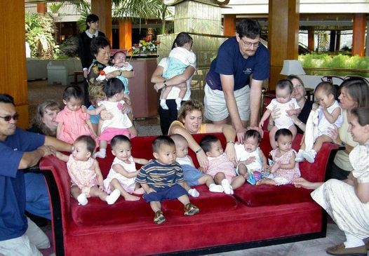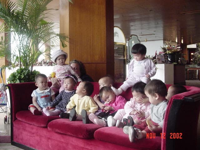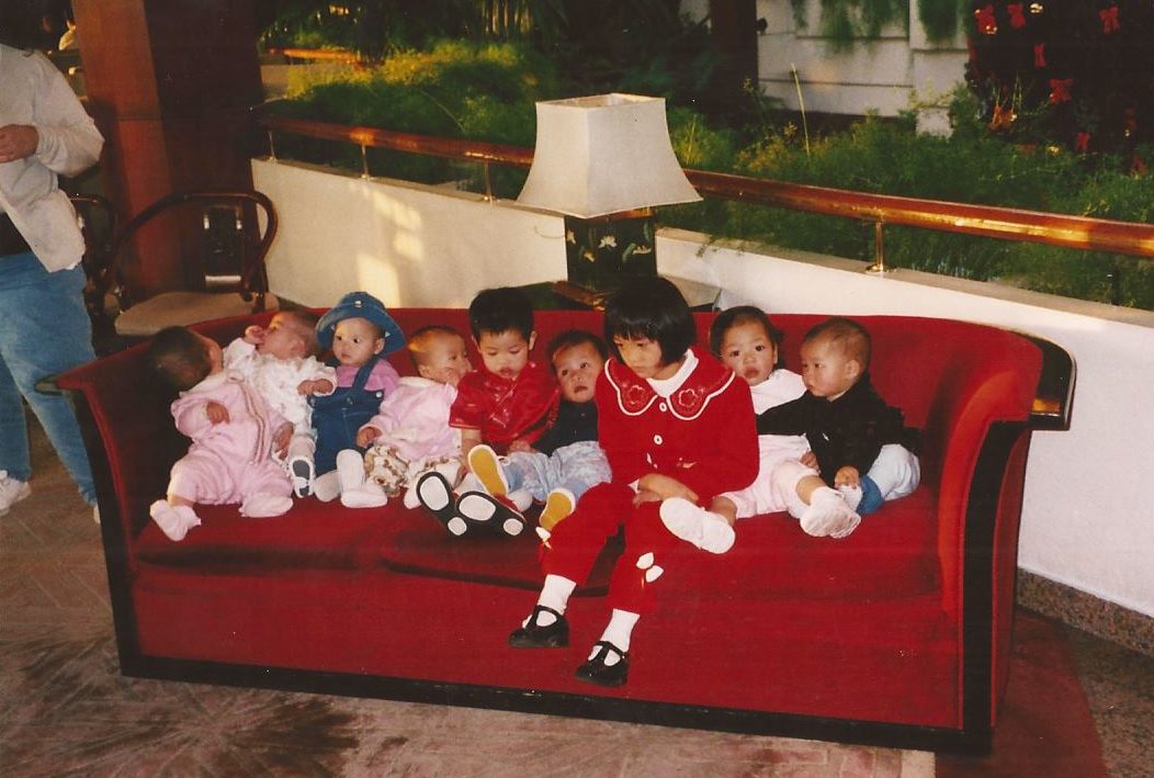 “September 2004. My Ethan is the only boy in the picture (wearing the blue striped shirt). It was an impossible task trying to get 13 babies to sit still on the red couch. Our travel group included 12 families that got along amazingly.” ~ Alison Profeta Fong, adoptive mom