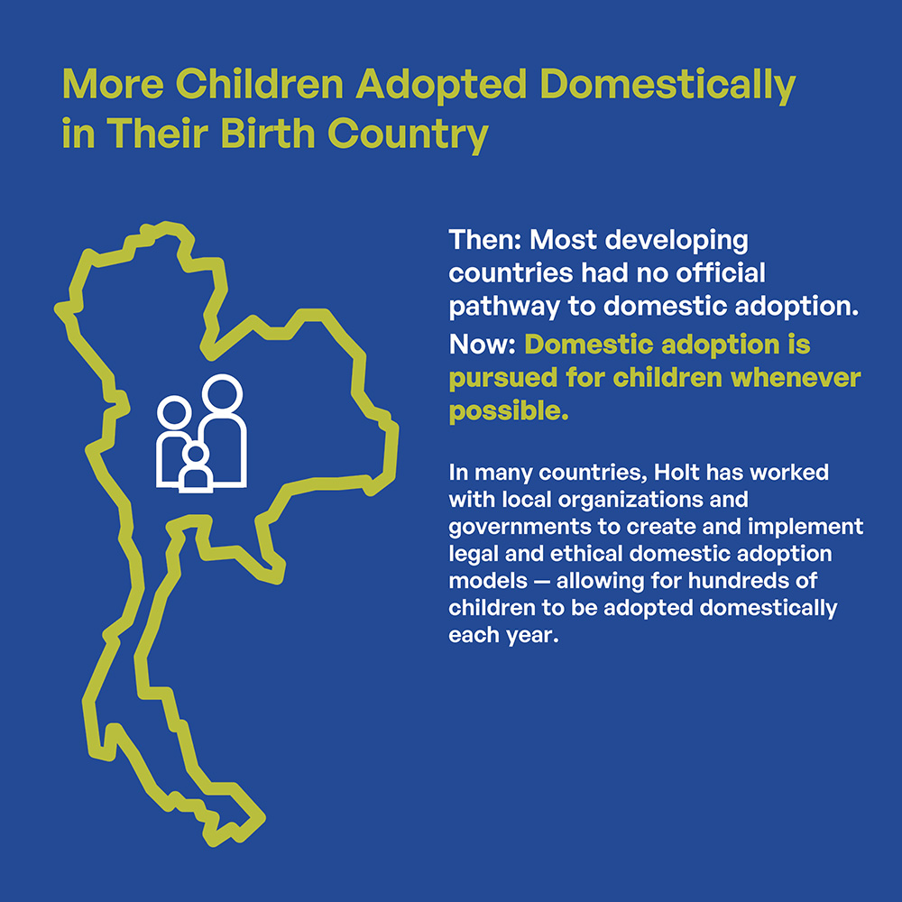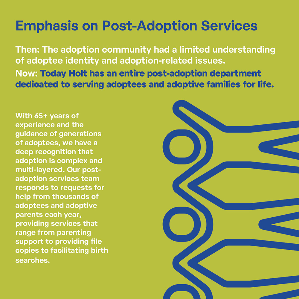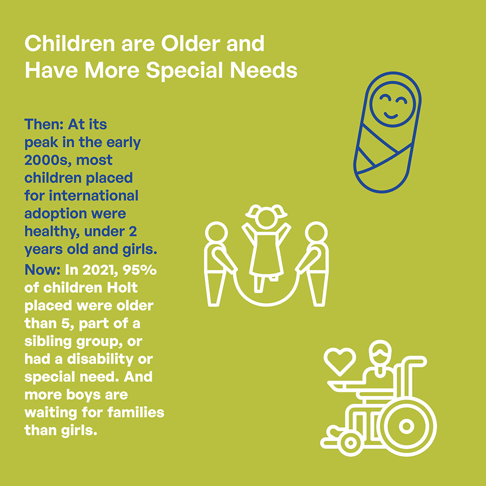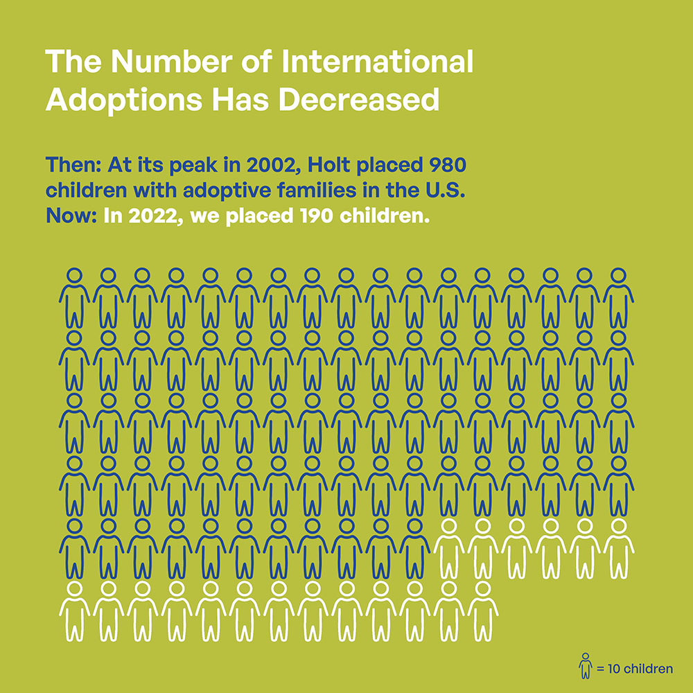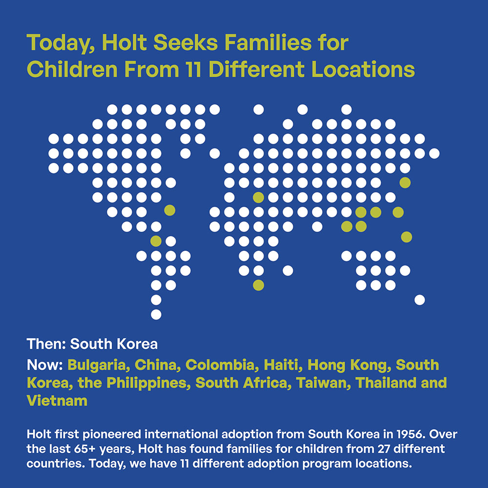 This National Adoption Month, we’re reflecting on some of the most significant ways international adoption has changed over the years. Holt first pioneered international adoption in 1956, with our number of children placed peaking in 2002. This series of infographics compares where we have been through 65+ years of history with where we are today as an international adoption agency.
