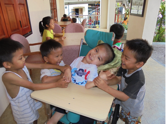Danh* was born in June 2007 and was abandoned when he was an infant. He is now enrolled in care in the House of Love in Cam Ranh, Khanh Hoa. He has cerebral palsy and was diagnosed with hydrocephalus, for which he received surgery to drain the excess accumulation of cerebrospinal fluid (CSF) from his brain. However, his brain was affected by the hydrocephalus and resulted in stiffness and some brain damage. Despite the fact that Danh received good care and attention from the nuns at his care center, some of his specialized needs were not met due to his caregivers’ lack of knowledge and skills in caring for children with cerebral palsy. While in care, the nuns focused mostly on providing him with proper diet, medical care when he gets sick, and good hygiene. As he got older, Danh spent most of his time lying in his crib and being in a room by himself. Danh could not move, sit up or walk by himself. He ate in a laying position and depended mostly on his caretakers to meet his daily needs. The caretakers mostly showed up and interacted with him shortly during feeding or bathing time or to change his diaper. The only means of entertainment for him was watching TV. He cried when the TV was turned off and felt happy when it was on.