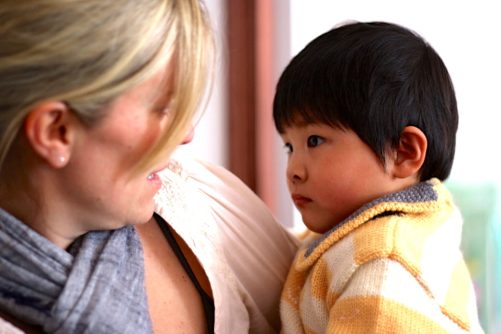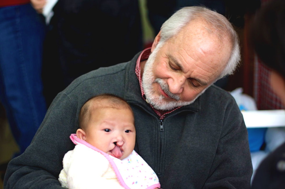Vision trip member Pat Roth holding a child at the Peace House in China.