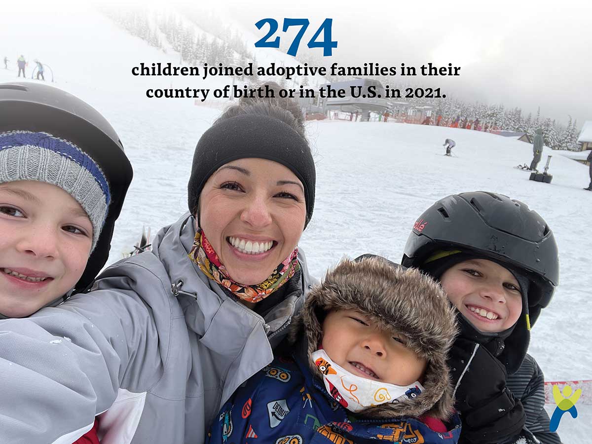 In many ways, 2021 seemed like a continuation of 2020 for children and families waiting to unite through adoption — slowing adoption processes and creating frustrating challenges for our teams around the world. Some families, especially those in the China process, are still waiting to unite with their child, and our hearts ache for these children and families. Thankfully, despite the challenges and restrictions caused by COVID, our dedicated teams around the world were able to continue working and advocating for children and families in the adoption process. And in many countries, adoptions did move forward and travel did resume— making it possible for 143 children to join loving families through international adoption. This was in no small thanks to child sponsors and donors, who not only support children while they wait to join their families, but also support the advocacy work required to complete the adoption process for every child. Through your generous giving in 2021, you also helped 21 children join adoptive families domestically in the U.S. and 110 children join adoptive families in their birth countries around the world.