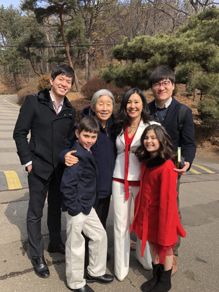 Esther Kim, Kim and her children outside of the Holt Korea office.