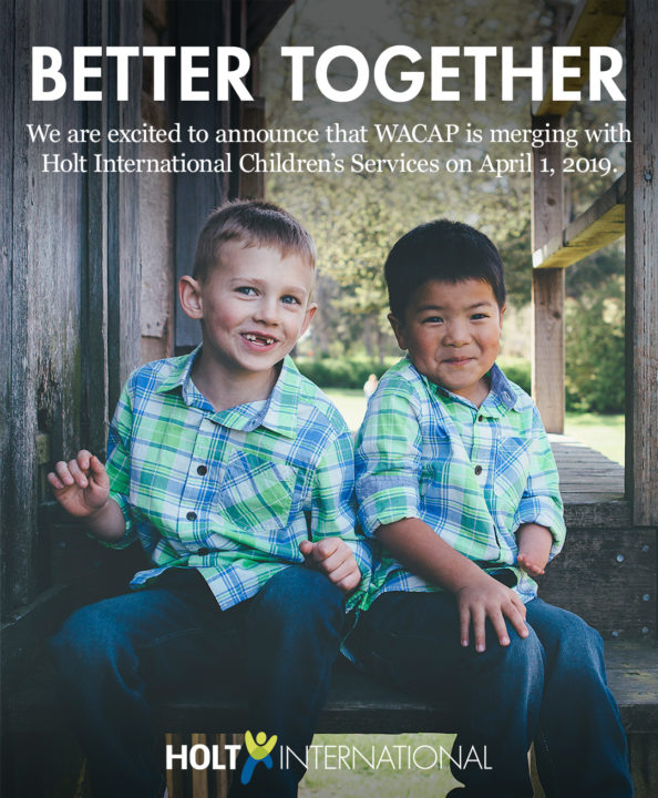 Today, we are making an exciting announcement that will better position Holt International to do the mission-critical, child welfare work at the heart of our organization. Holt will merge with World Association for Parents and Children (WACAP) — a highly respected international adoption and child welfare agency — under the name Holt International Children’s Services on April 1, 2019.